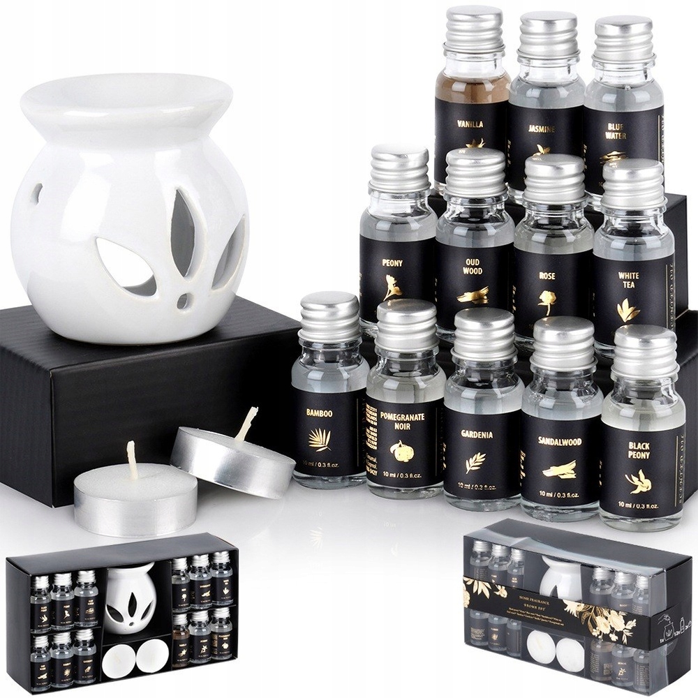 ✅ Набор с ароматической горелкой и 12 маслами - В комплект входит элегантная ароматическая горелка размером 7 х 7,5 см, 12 ароматических масел емкостью 10 мл: черный пион, гранат, бамбук, древесные ноты, ваниль, белый чай, роза, пион, сандал, гардения, жасмин и голубая вода. В комплект также входят две чайные свечи.