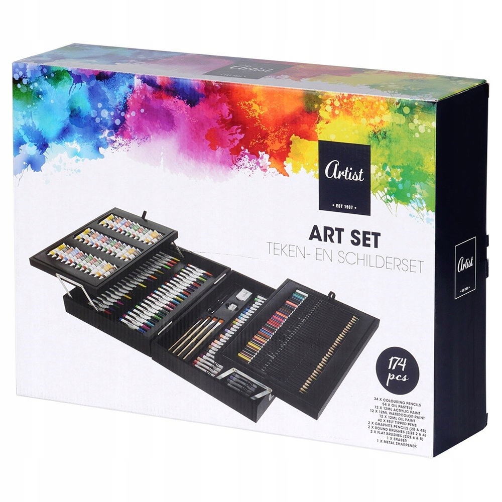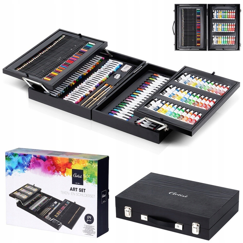 ✅ Набор для рисования и раскраски в деревянном футляре - Полный набор, состоящий из 174 элементов. В набор входят: 34 карандаша, 54 масляных пастели, 12 акриловых красок по 12 мл, 12 акварельных красок по 12 мл, 12 масляных красок по 12 мл, 42 маркера. Коробка имеет размеры 45 х 32,5 х 10,5 см. Чемодан – удобное и удобное решение для хранения и переноски.