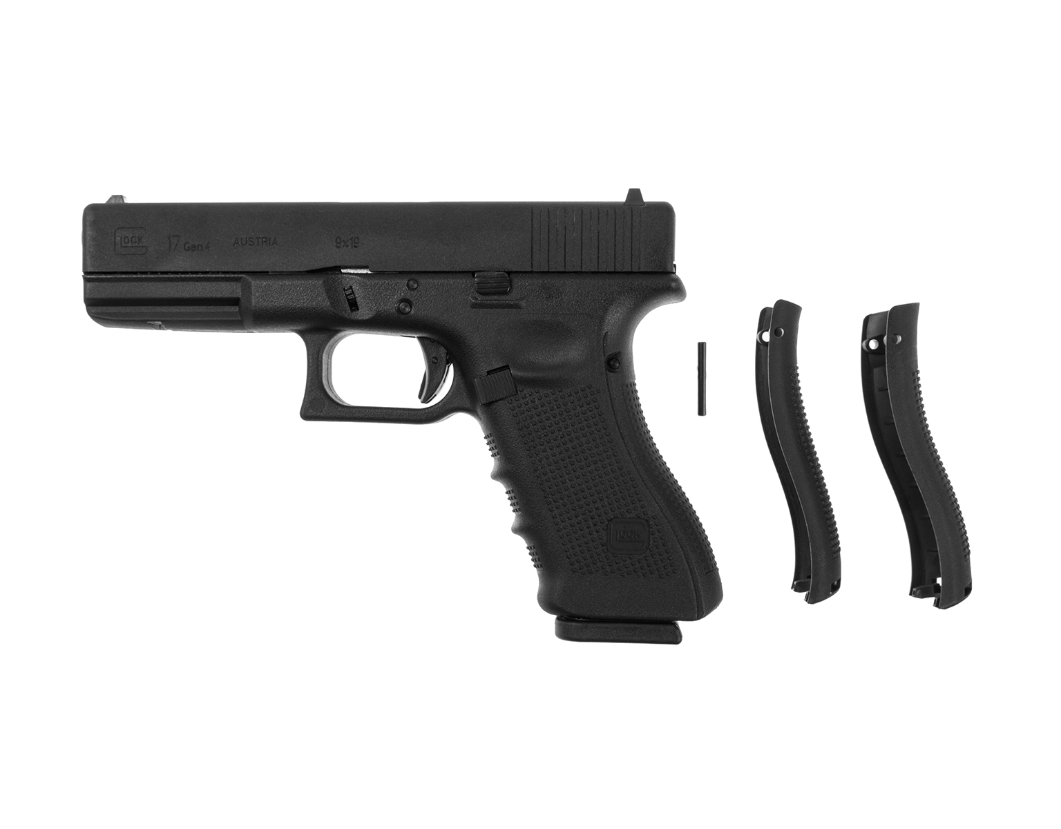 Реплика Glock 17 gen 4 имеет текстурированную рукоятку, выточки для пальцев и сменные задние накладки на рукоятку,