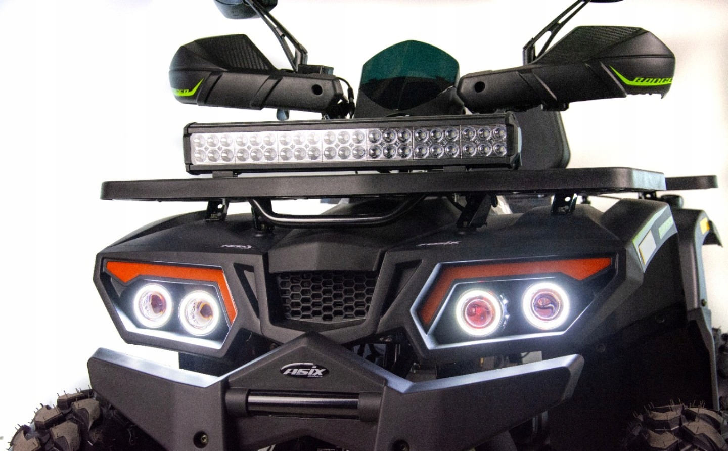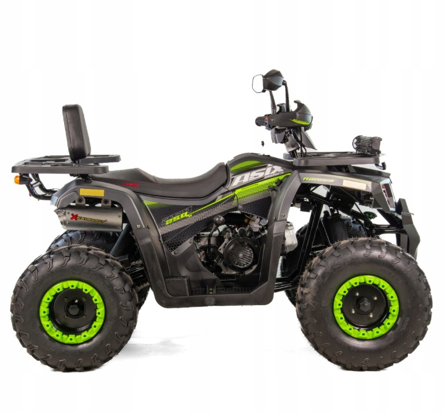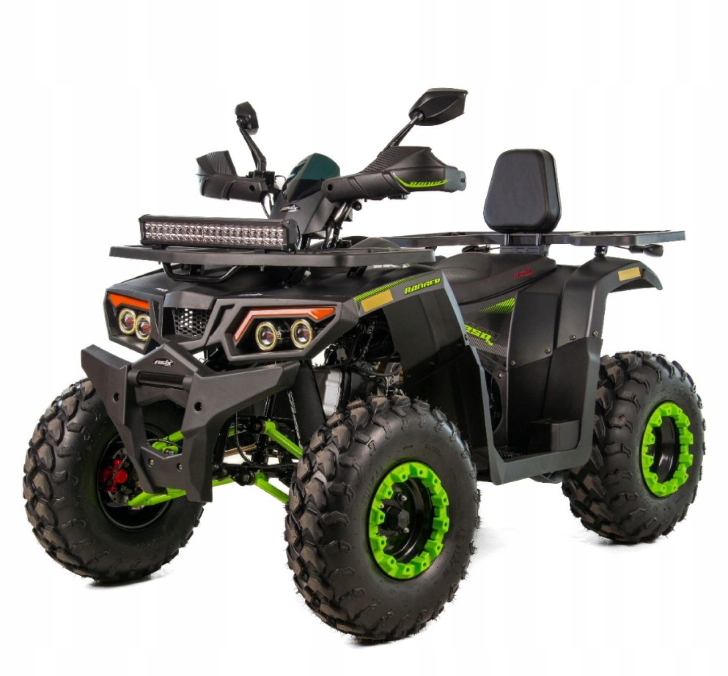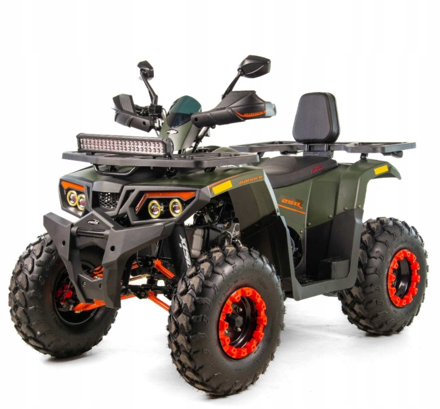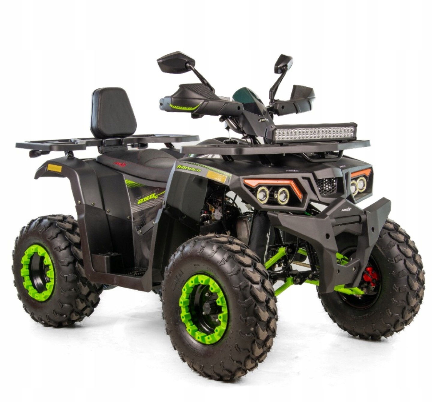 Quad Ranger - это автомобиль для молодых людей и взрослых. Он управляется двигателем с четырьмя ударами 250 см, настраиваемым с автоматической коробкой передач. Большая, перекрестная модель, оснащенная светодиодным освещением, электронным счетчиком, ручными панелями, зеркалами, спинкой и гидравлическими дисковыми тормозами.