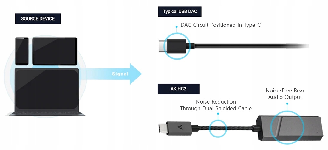 В AK HC2 используется балансный выход 4,4 мм — в отличие от предыдущей модели, которая использует несбалансированный выход 3,5 мм, что позволяет использование большего количества наушников, предназначенных для оптимального использования звука Hi-Fi с небольшим USB-ЦАП.