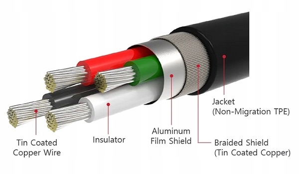 Кроме того, весь кабель обернут алюминиевой фольгой для блокировки внешнего шума – одного из самые большие проблемы со звуком,