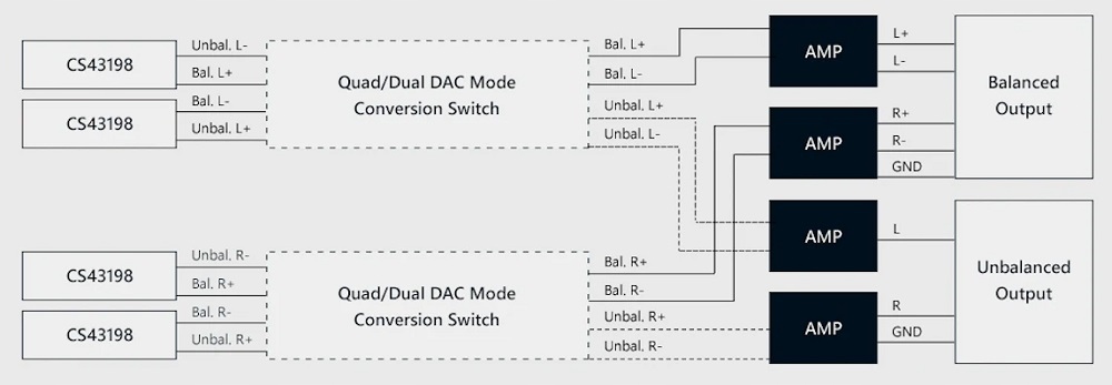 Двойной режим переключения предлагается /Quad DAC, который позволяет пользователям настраивать и улучшать характеристики управления питанием, дополнительно увеличивая длительное время непрерывного воспроизведения, что является основной особенностью серии A.