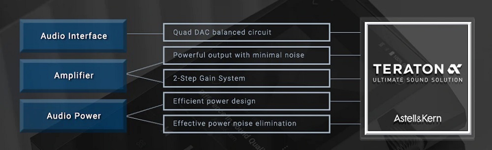 TERATON ALPHA. Разработанная в результате бесконечных исследований, это уникальная технология от Astell&Kern, предназначенная для воспроизведения аудиосигнала, максимально приближенного к оригинальному звуку, благодаря эффективному шумоподавлению источника питания, эффективному управлению питанием и неизменному усилению, а также полностью преобразованный интерфейс вывода звука.