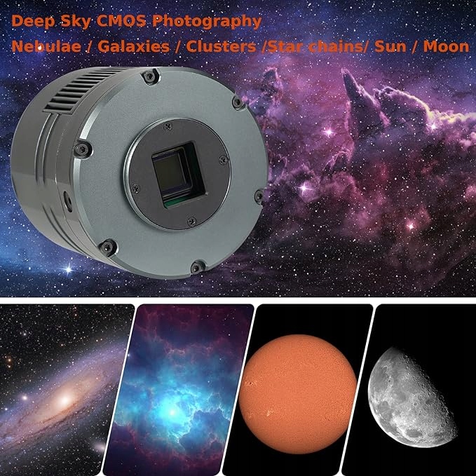 IMX533 Квадратный датчик цвета размером 1 дюйм; высокое разрешение 3008х3008 и размер пикселя 3,76 мкм; получать цветные астрономические изображения высокого разрешения; легко делать цветные фотографии объектов глубокого космоса, таких как туманности; галактики и звездные скопления
