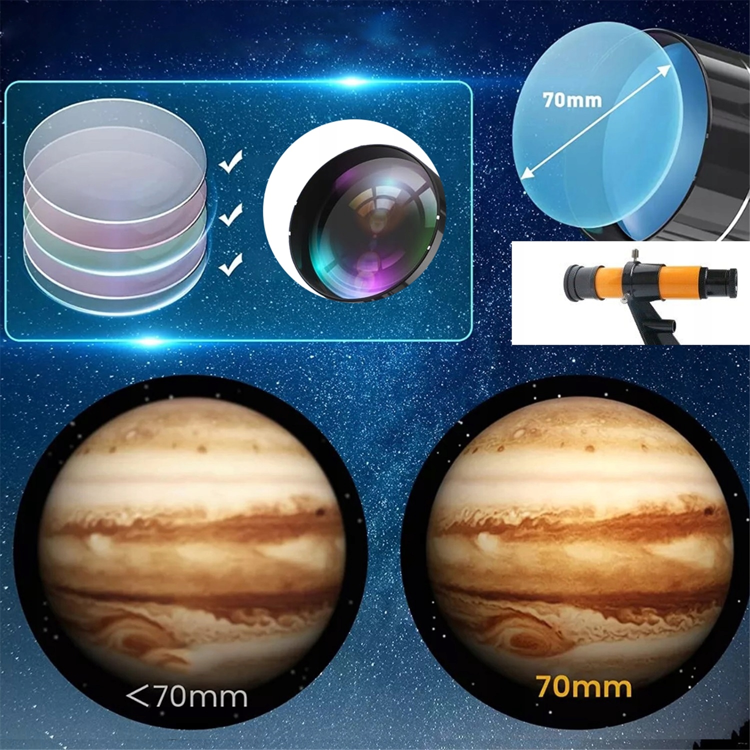 - Оснащен большим объективом линза. Наш астрономический телескоп-рефрактор с апертурой 70 мм и фокусным расстоянием 300 мм обеспечивает более четкое и яркое изображение по сравнению с другими телескопами с малой апертурой.