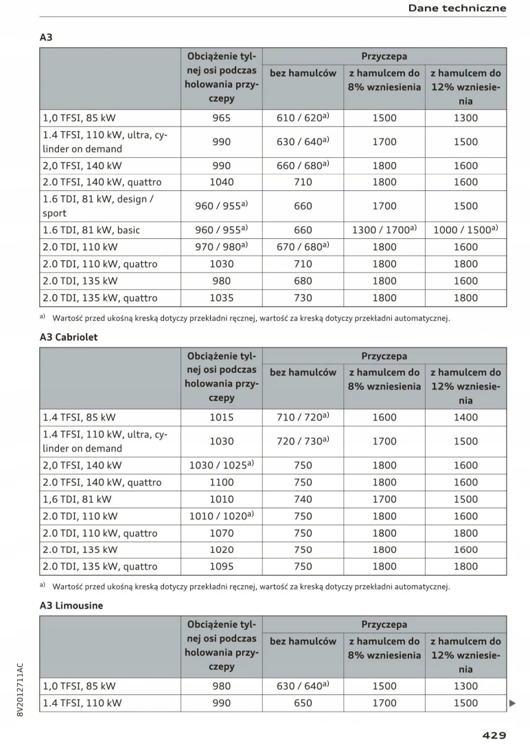 Модель Audi A3 с 2016 по 2020 год, рестайлинговая модель: A3, A3 Cabriolet, A3 Limousine, A3 Sportback, A3 Sportback e-tron, A3 Sportback g-tron, S3, S3 Cabriolet, S3 Limousine, S3 Sportback В инструкции содержится описание 10 модификаций Audi A3 и телефонной радионавигации. Состояние - новый Тип - книга Страниц - 448 Польский язык Издание - 2016 г. Обложка - цвет Центр - черно-белый Бумага - мел матовая А5 149х210