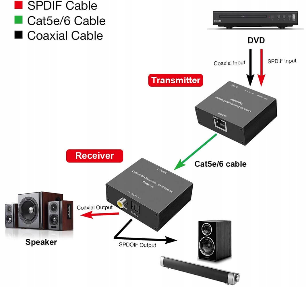 Аудиопередатчик, позволяющий передавать оптический Toslink или цифровой (коаксиальный) звук по LAN-кабелю Cat5E или Cat6 на расстояние до 150 метров. Только передатчик требует источника питания постоянного тока 12 В (блок питания входит в комплект) и имеет светодиодный индикатор.