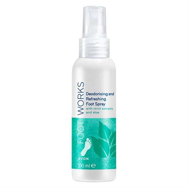 Освежающий спрей для ног Avon Footworks с экстрактом алоэ и мяты охлаждает и мгновенно освежает кожу, успокаивая уставшие ноги.