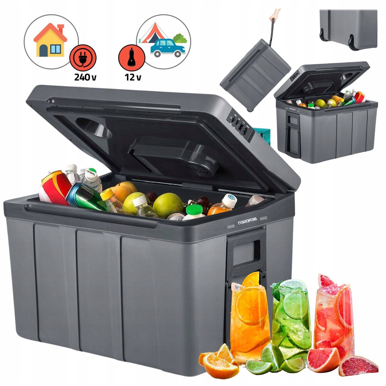 Холодильник имеет складную ручку, благодаря которой холодильник легче переносить на другие, меньшие по размеру. Холодильник поддерживает температуру до 3 часов (после отключения от сети), поэтому он идеален для костра или пляжа!