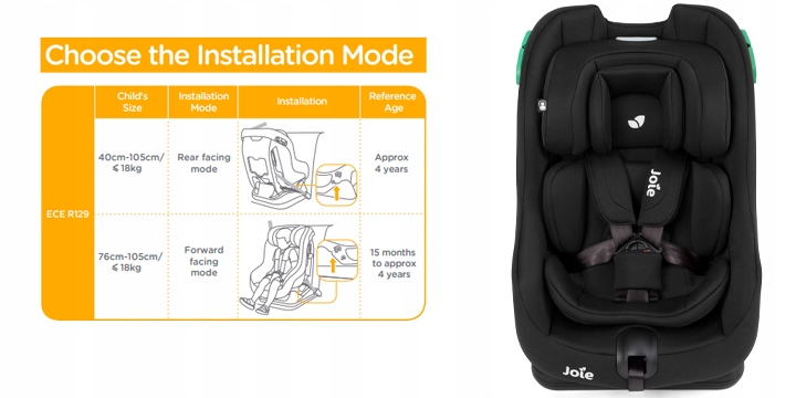Сиденье крепится с помощью 3-точечного автомобильного ремня, его можно устанавливать вперед или назад. В режиме RWF для перевозки ребенка задом наперед нет ограничений: сиденье позволяет детям ростом 40–105 см и весом 0–18 кг ездить спиной вперед. Если родитель хочет использовать кресло в режиме FWF, необходимо выполнить одно условие: рост ребенка должен быть 76 см, а вес - 9 кг.
