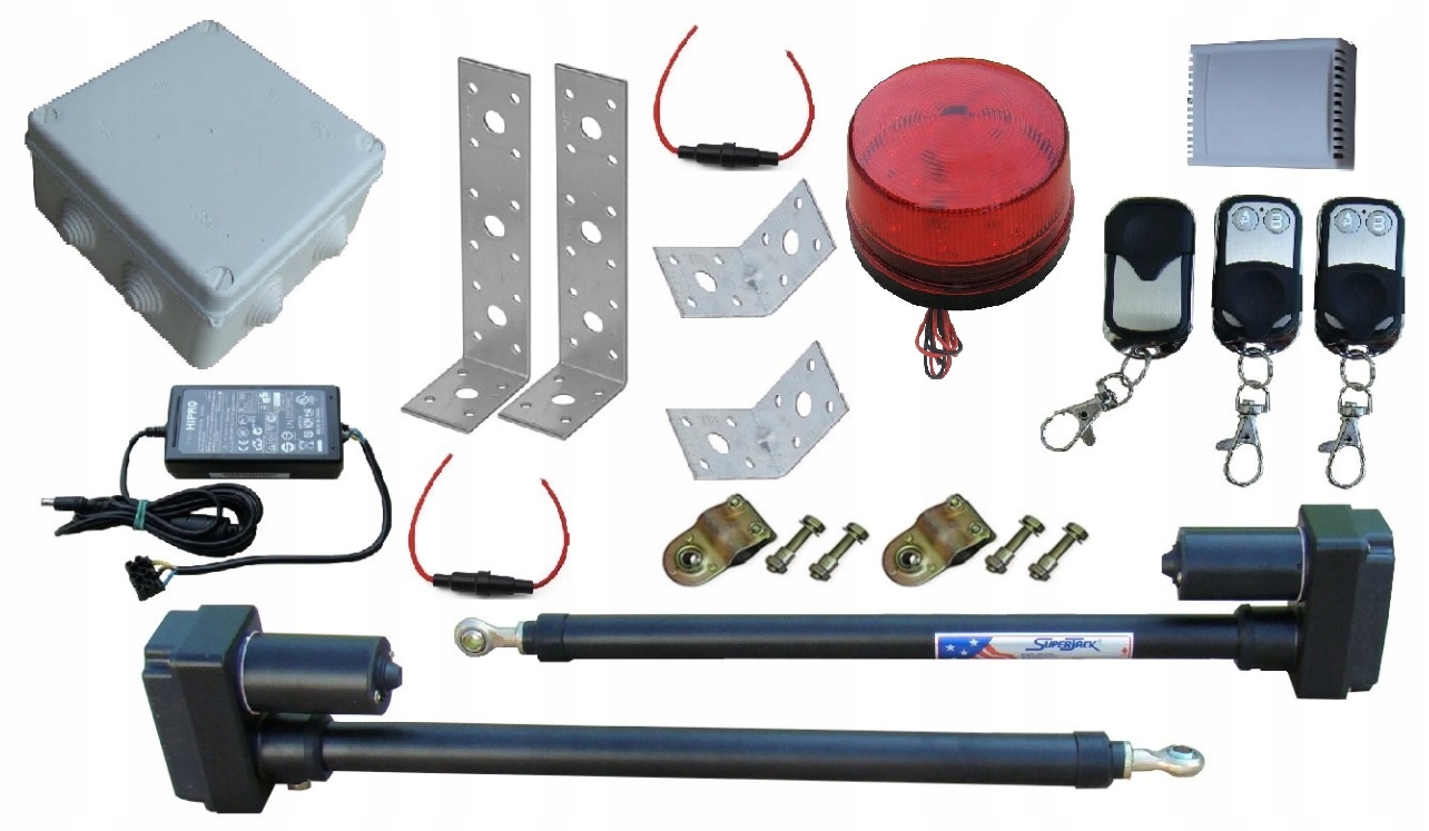 Предлагаемый комплект предназначен для двухстворчатых ворот. В комплект входит бесплатный блок питания 12В для управления и питания самих исполнительных механизмов. Приводы питаются от приемника дистанционного управления напряжением 12 В, что обеспечивает высокую безопасность. Конечно, если нет источника питания 230 В, мы можем запитать всю систему от аккумулятора напряжением 12 В, что обеспечит работу 24 часа в сутки, независимо от нашего поставщика электроэнергии. При размещении вне здания приемник дистанционного управления и блок питания должны быть помещены в герметичный пластиковый корпус, входящий в комплект (размеры примерно 18 х 18 х 8 см).
