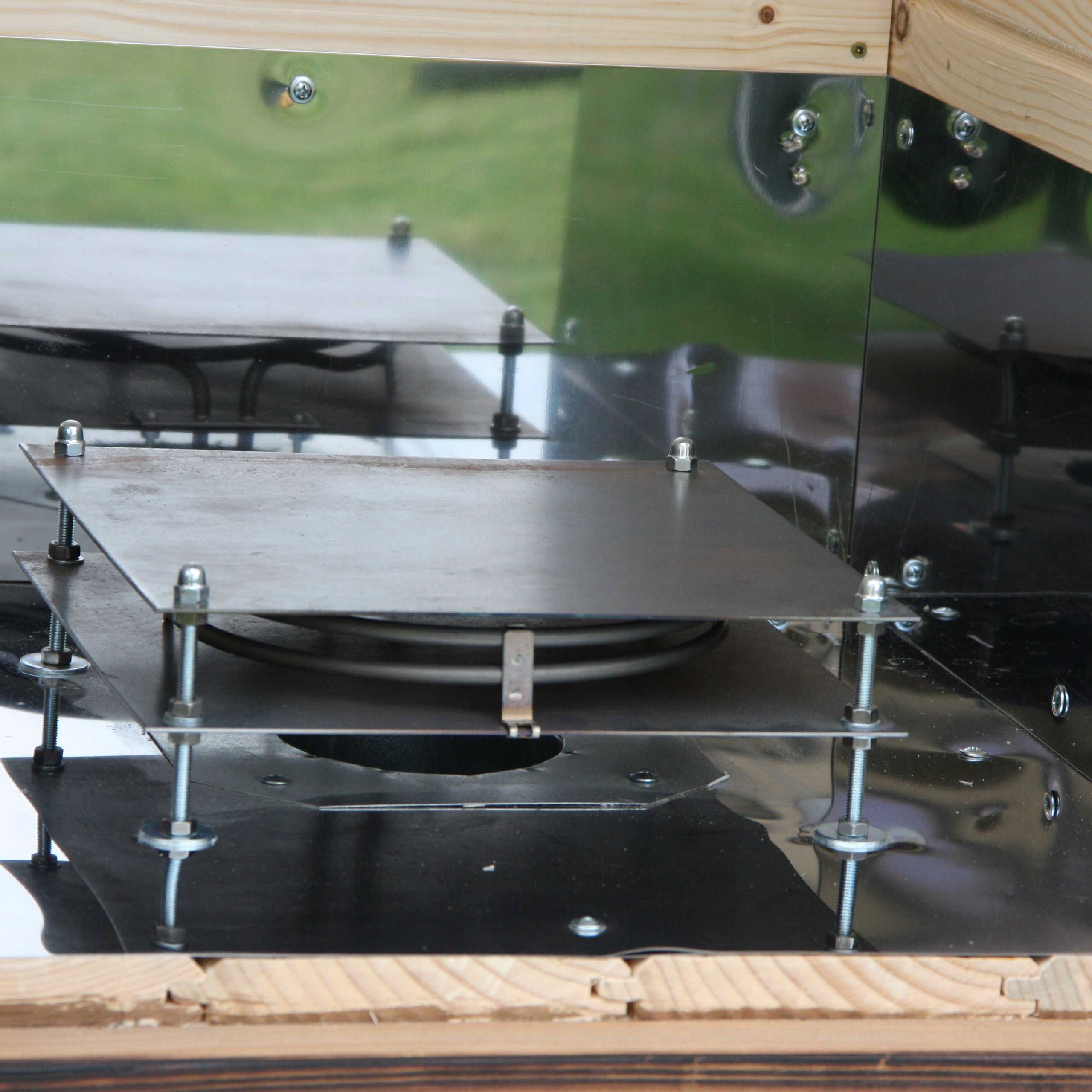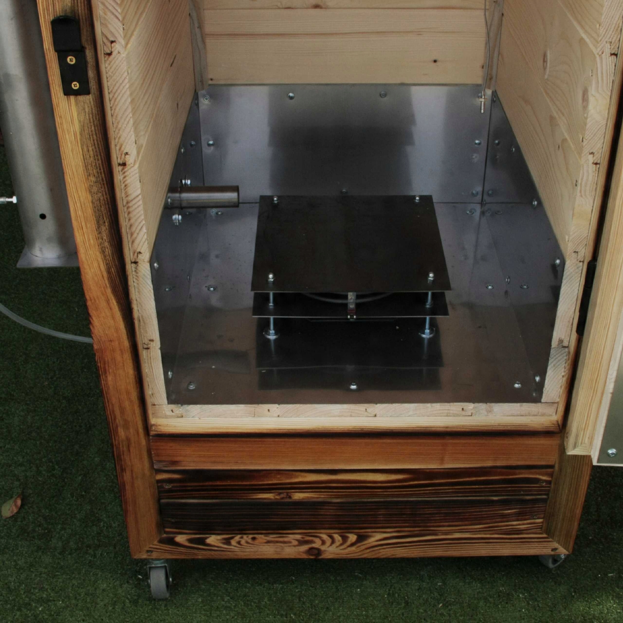 - Полностью коптильни автоматизированный. Постоянная заданная температура поддерживается нагревателем мощностью 2000 Вт, управляемым ПИД-регулятором. Такое решение обеспечивает наилучшую стабилизацию температуры в коптильне. Дополнительно мы использовали двойной дефлектор, благодаря чему поддерживаем низкое энергопотребление.