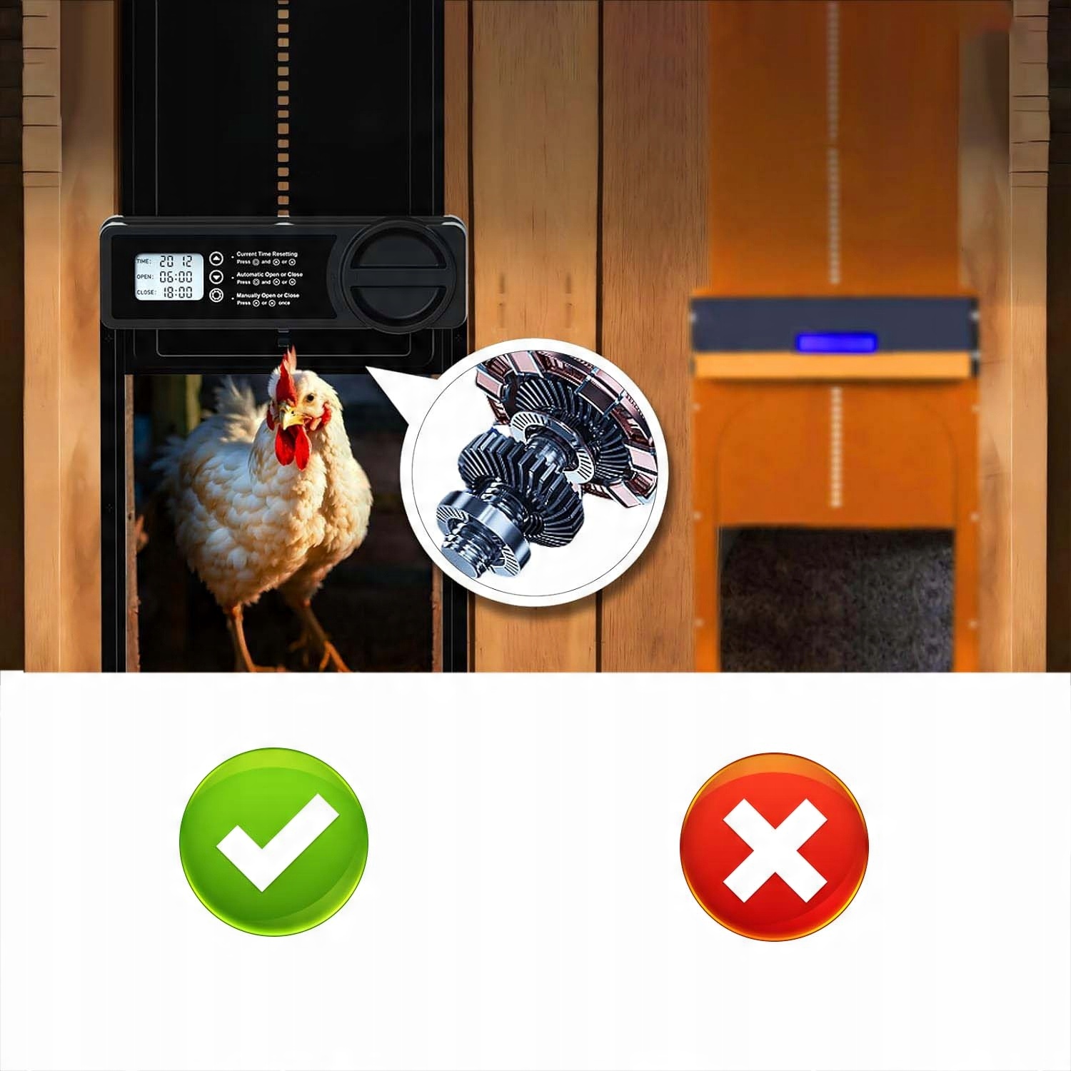 Механизм безопасности : интегрированный датчик обнаруживает препятствия в области двери и немедленно останавливает процесс закрытия, чтобы предотвратить травму курицы и обеспечить их безопасность. Мы придаем большое значение безопасности, и мы абсолютно доверяем качеству наших продуктов.