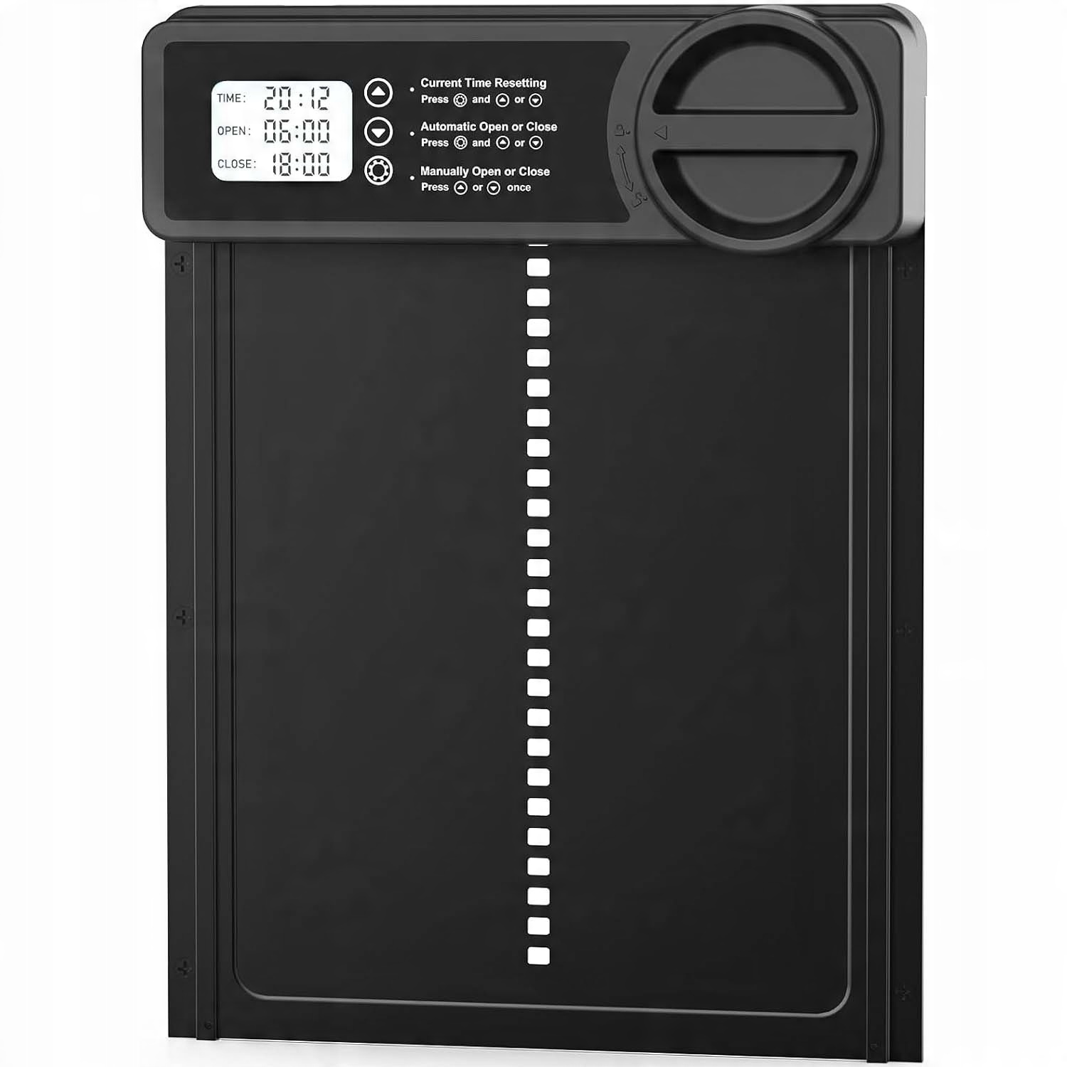 Точный режим времени : благодаря точным режиму программирования наш продукт работает надежно при любых погодных условиях и избегает проблем с случайным открытием или закрытием из -за нестабильных датчиков света. Это устраняет риск того, что солнечная дверь не будет работать без солнечного света, чтобы убедиться, что ваши цыплята не будут закрыты.