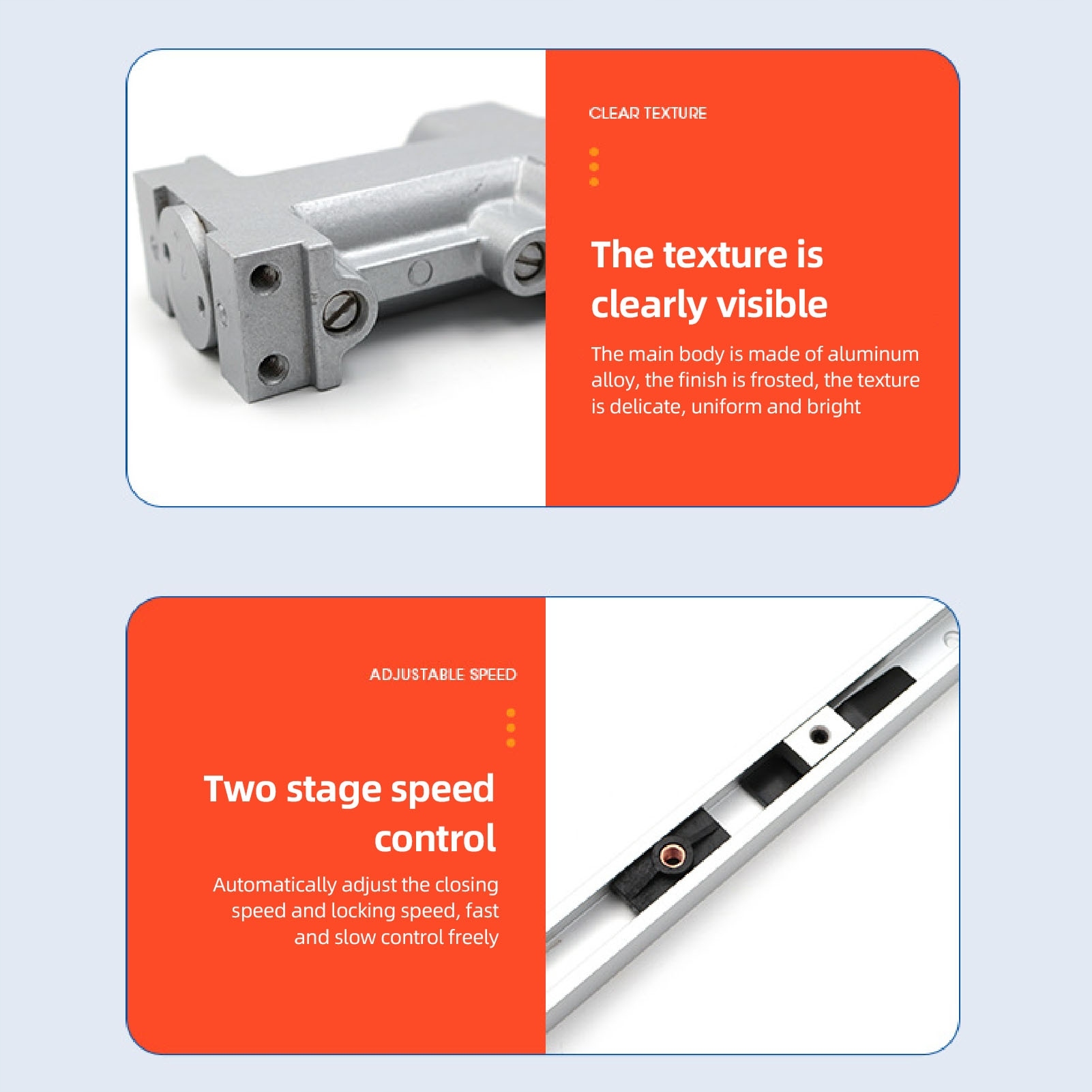 3. Конструкция из алюминиевого сплава: автоматический дверной доводчик, изготовленный из высококачественного алюминиевого сплава, отличается высокой прочностью и устойчивостью к повреждениям, обеспечивая долгосрочную работу и надежность.