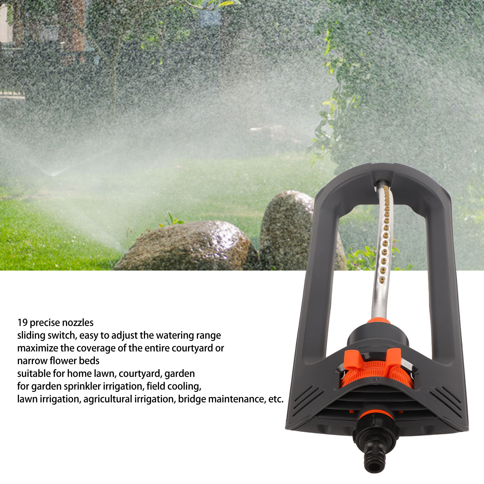 Особенность:1. 19 форсунок: автоматический осциллирующий разбрызгиватель с 19 точными форсунками и ползунковым переключателем с простой регулировкой диапазона полива позволяет максимально охватить весь двор или узкие цветочные клумбы.