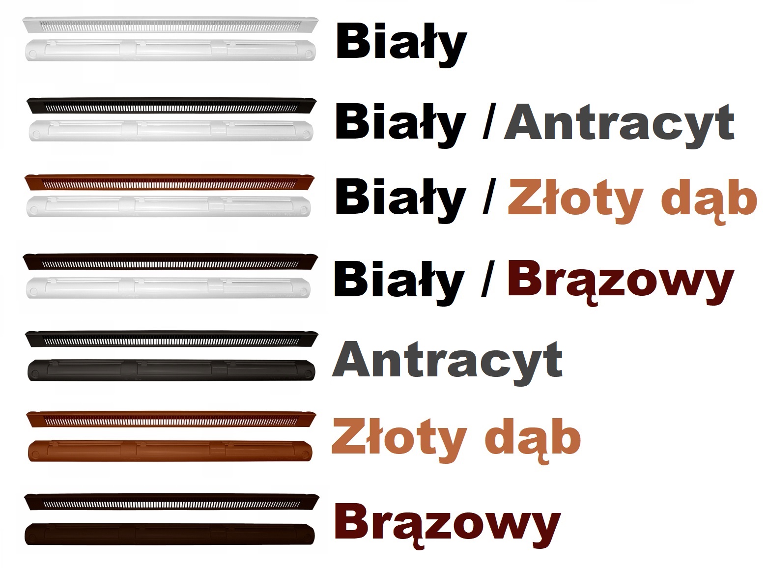 Мы также предлагаем другие цвета этих дефлекторов, а также смешанные цвета, то есть белый внутри и коричневый, карамельный, антрацитовый, серый снаружи.