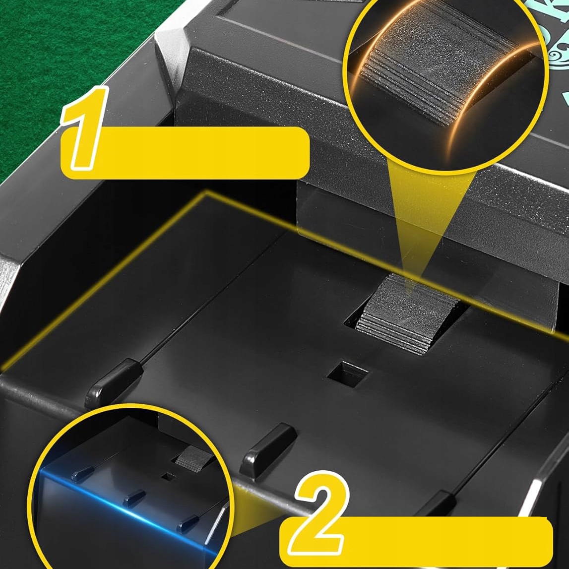🃏【U-ОБРАЗНАЯ ДИЗАЙН КАНАВКИ】:Автоматическое устройство для тасования карт имеет U-образную конструкцию канавок, что делает процесс тасования более плавным. Благодаря сильно включенным шестерням он эффективно предотвращает перетасовку карт и обеспечивает приятное перетасовывание.