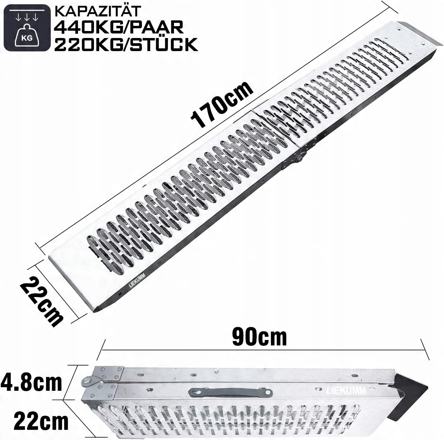 Сверхпрочные стальные погрузочные рампы весят 7 кг на каждую рампу, и каждая рампа выдерживает до 220 кг. Грузоподъемность обеих частей вместе может достигать 440 кг.