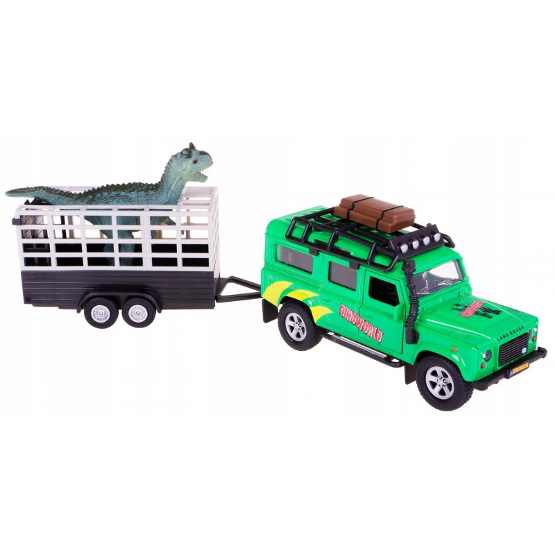 Land Rover с прицепом для перевозки динозавров – это точно изготовленная модель автомобиля, изготовленная преимущественно из металла и пластика, оснащенная резиновыми шинами с инерционным приводом. У машины открывающиеся двери и задний люк, все элементы зеленого цвета. Прицеп, входящий в комплект, также имеет открывающиеся боковые и задние створки, обеспечивающие легкий доступ к перевозимому динозавру. В набор также входит модель динозавра.