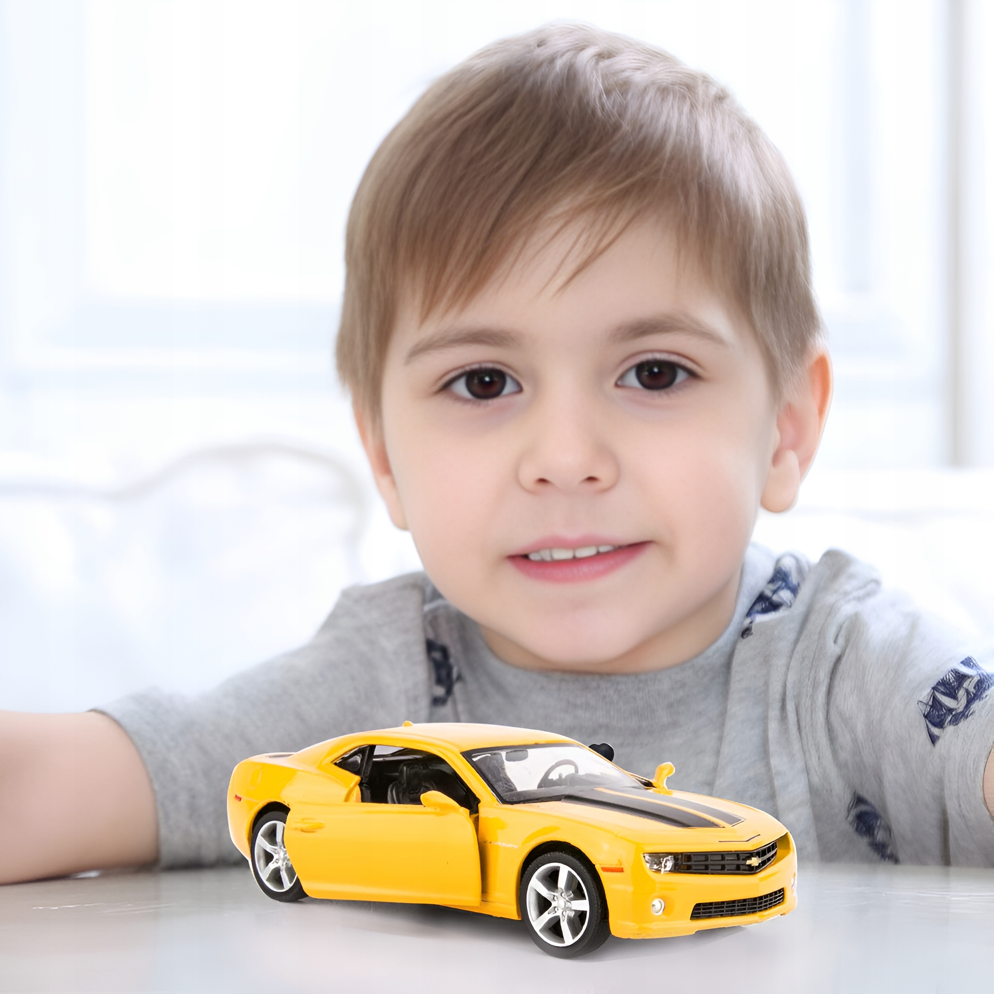 со спортивной графикой – идеальное предложение для любителей быстрой езды. Вы также влюбитесь в наш Chevrolet Camaro, уникальную звезду фильмов об автоботах. Автомобиль сделан очень тщательно и эстетично, с вниманием к мельчайшим деталям, что наверняка порадует каждого маленького любителя ралли. В машине есть звуковые и световые эффекты, открывающиеся двери, капот и багажник. Машинка едет, перемещая игрушку назад по гладкой поверхности с помощью силового механизма трения, т.е. ускоряясь за счет перемещения игрушки по гладкой поверхности.