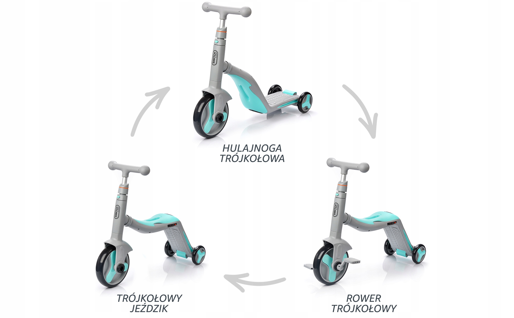 Быстро и эффективно, без использования инструментов вы можете трансформировать самокат в одно из трех различных транспортных средств.
