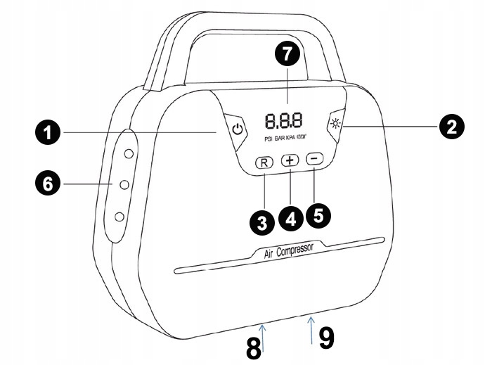 - Встроенный цифровой манометр PSI / BAR / KPA / KG/CM2