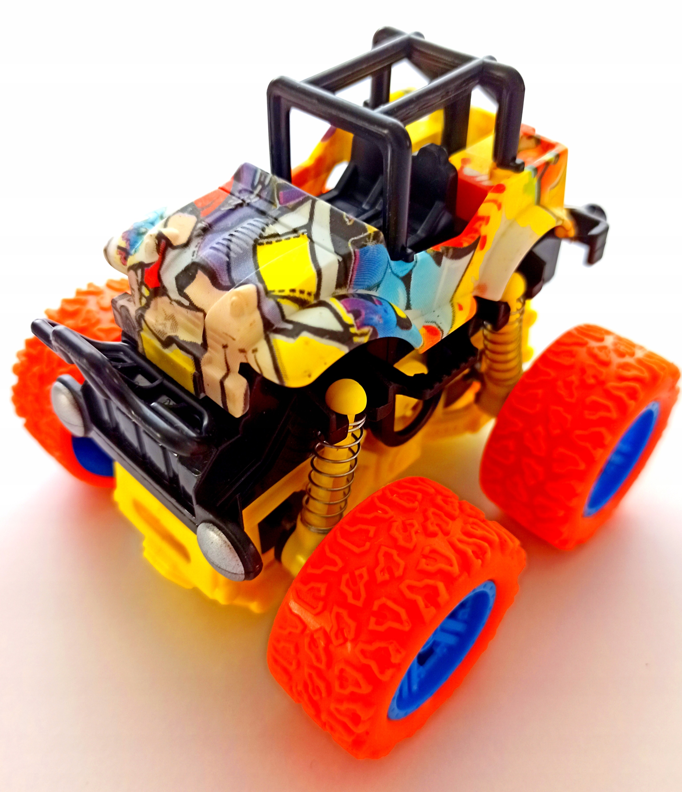 Машинки массивные, имеют фрикционный привод – достаточно нажать и машина едет сама. В машине есть пружины. Он может очень быстро ездить и преодолевать все препятствия. Когда он сталкивается с чем-то большим, он может вращаться или подпрыгивать, менять направление и продолжать движение.