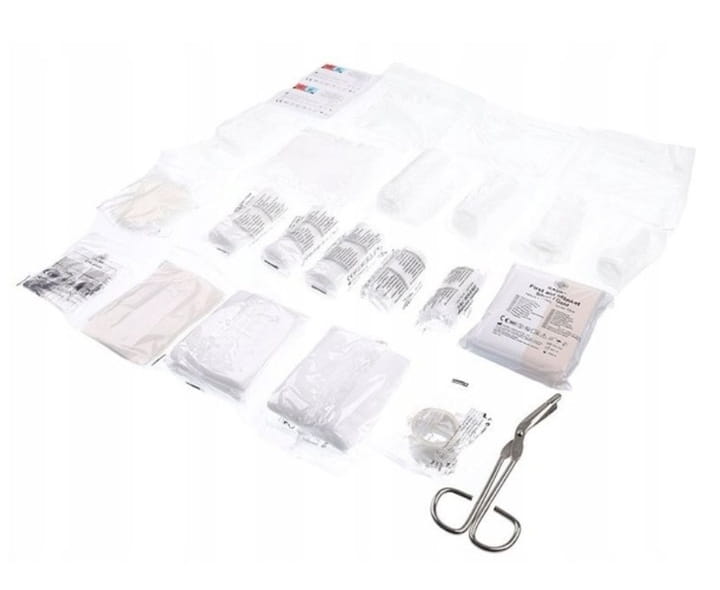 - Перечень оборудования: Название: Перевязочный вкладыш DIN 13164 - 2022 Все изделия в аптечке имеют клей CE DIN 13019-A, 5 м x 2,5 см - 1 шт. Набор пластырей перевязочных DIN 13019-E - 1 упаковка (14 шт.) Бинт эластичный DIN 61634-FB6, 6 см х 4 м - 2 шт. Бинт эластичный DIN 61634-FB8, 8 см х 4 м - 3 шт. Перчатки виниловые одноразовые DIN EN 455 - 4 шт. (2 пары) Салфетка перевязочная DIN 13152-А, 60 см х 80 см – 1 шт. Маска медицинская одноразовая EN 14683:2019+AC: 2019 ТИП I - 2 шт. Индивидуальная перевязка DIN 13151-К, 6 см х 8 см - 1 шт. Индивидуальная перевязка DIN 13151-М, 8 см х 10 см - 2 шт. Индивидуальная перевязка DIN 13151-G, 10 см х 12 см – 1 шт. Компресс DIN 13164-2022 10 см х 10 см - 6 шт (3 упаковки) Бандаж треугольный DIN 13168-D, 96 см х 96 см х 136 см - 1 шт. Термоодеяло (спасительное) 160 см х 210 см - 1 шт. Ножницы DIN 58279-А145 – 1 шт. Влажные салфетки – 2 шт. Инструкция по оказанию первой помощи на польском языке - 1 шт.