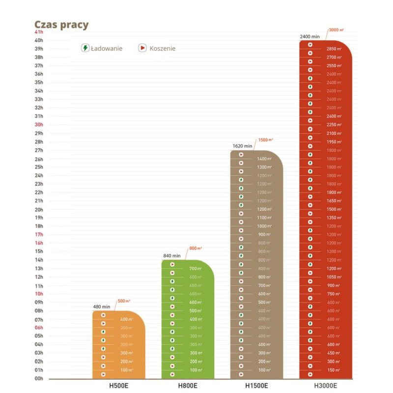 Время зарядки, почасовая мощность и эффективность работы различаются в зависимости от модели. По таблице выберите подходящую модель в зависимости от размера вашего газона. Navimow H3000E может косить газон площадью 3000 м2 примерно за 40 часов.