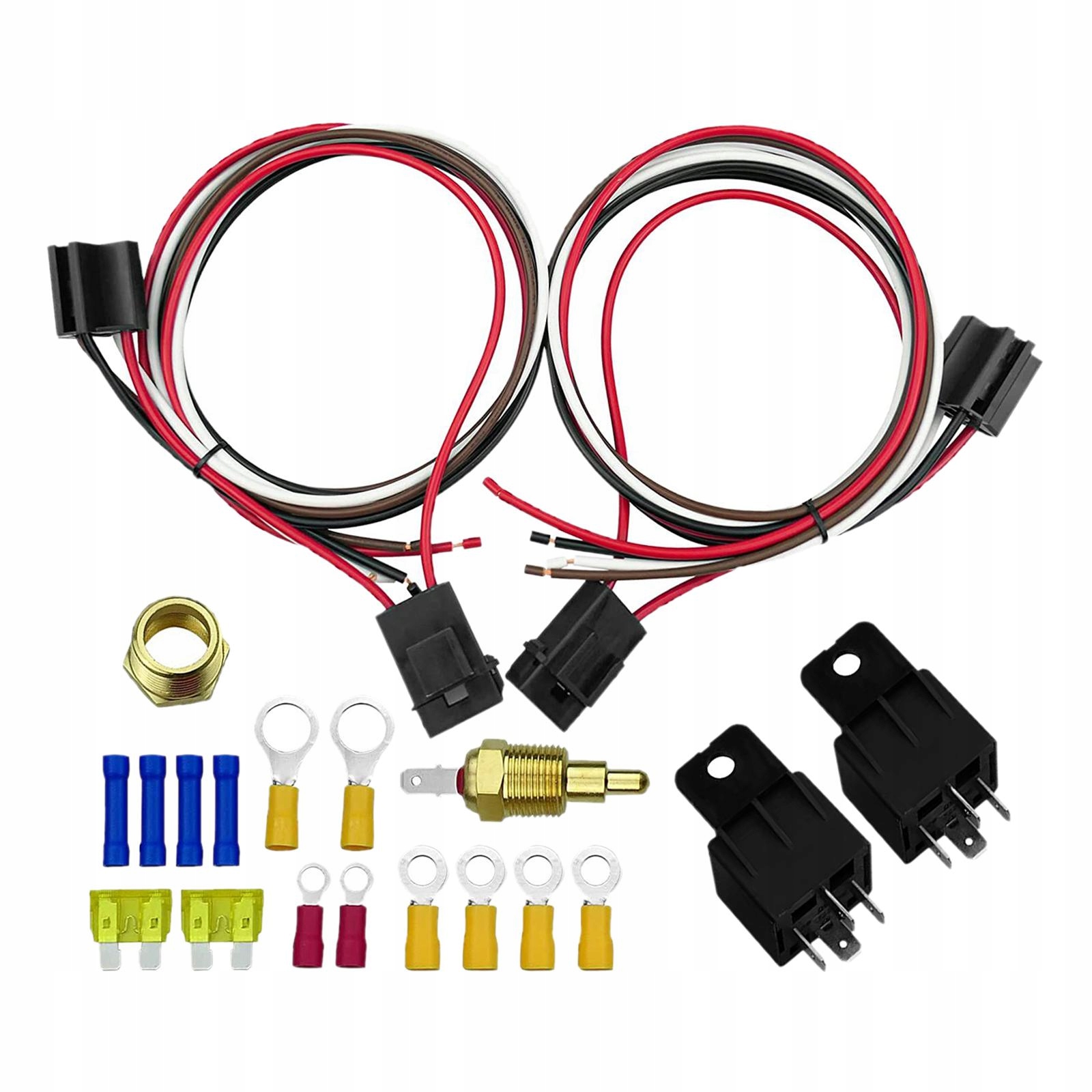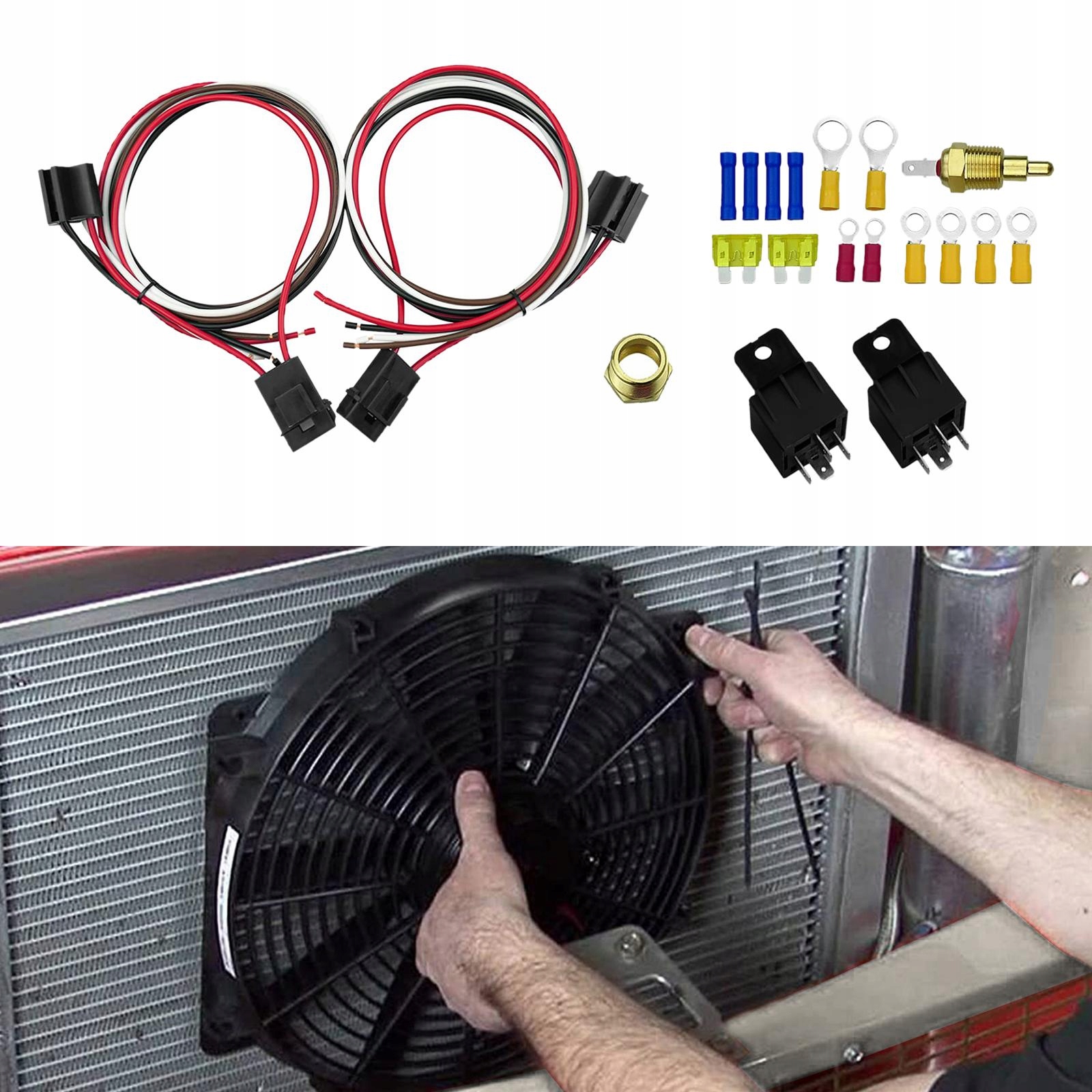 Комплектация: Включает 1 электрическую схему, 2 реле на 40 А с жгутом проводов, 1 температурный переключатель (185 включено, 175 выключено), 1 резьба 3/8 дюйма, 1 3/ Переходник с 8" на 1/2", 2 встроенных держателя предохранителей, 2 предохранителя на 20 А, 8 зажимов, 4 наконечника вентилятора.