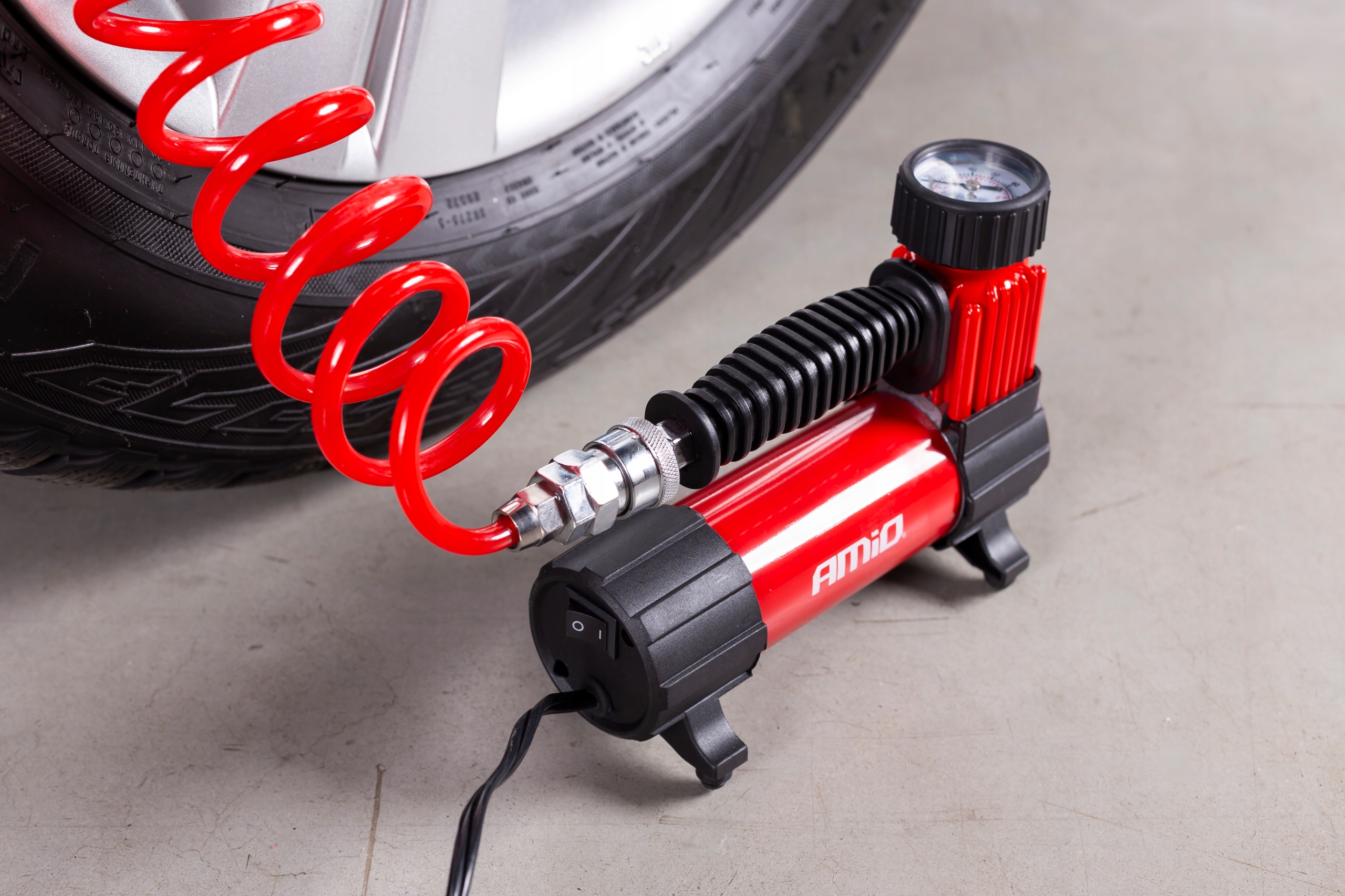 Компрессор – практичное устройство для владельцев четырех или двух колес. Компрессор удобен благодаря своим небольшим размерам и прочному металлическому корпусу, что обеспечивает долговечность устройства - корпус и шестерни полностью изготовлены из металла. Общий вес представленного устройства составляет почти 1,5 кг. Компрессор имеет спиральную воздушную трубку с навинчивающимся металлическим наконечником для накачивания клапанов автомобиля и набор дополнительных насадок: два конических и один игольчатый для накачивания шариков. На резиновых ножках, исключающих вибрацию во время работы. Компрессор обеспечивает эффективную и бесшумную работу.