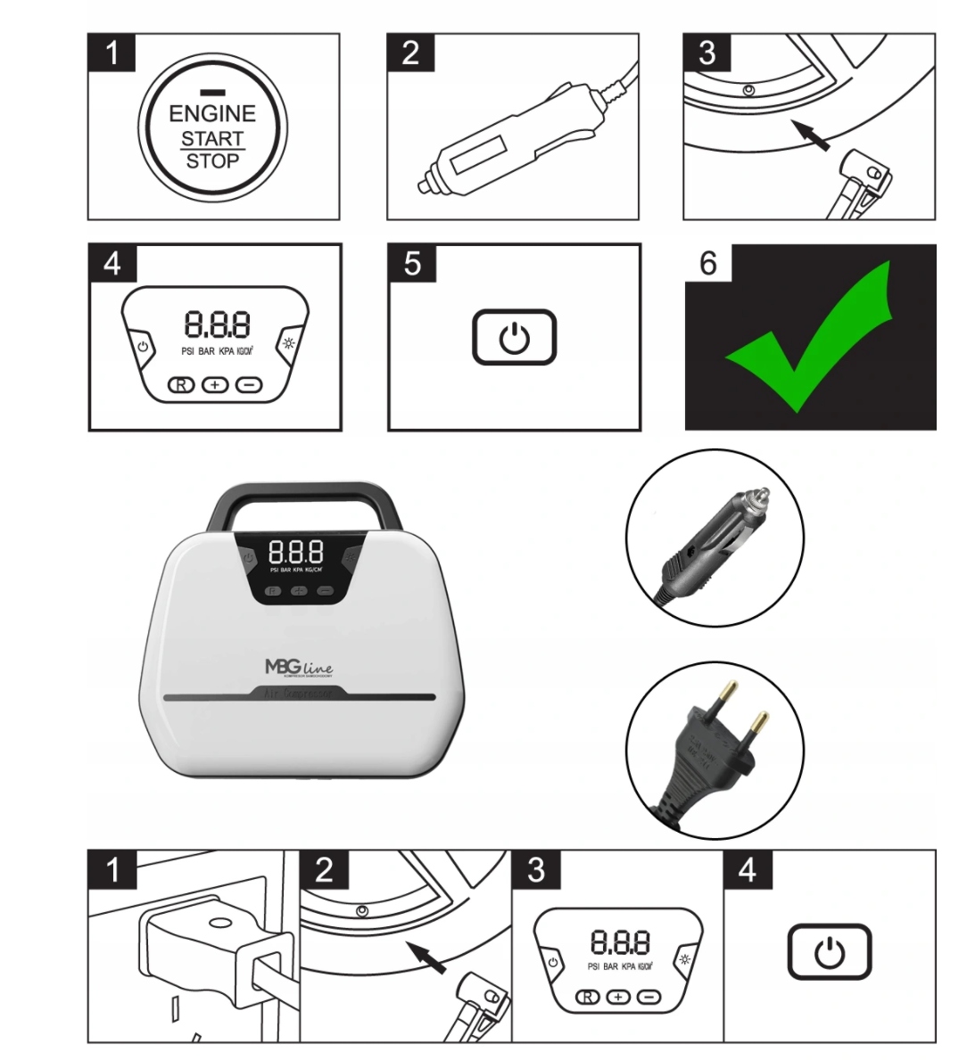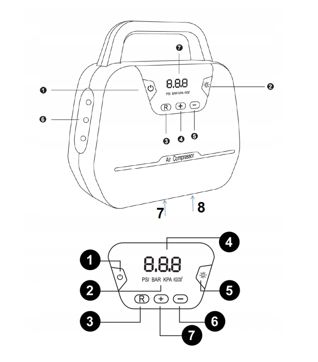 Подключите компрессор к источнику питания, кнопками «+» и «-» установите нужное значение давления, кнопкой M измените единицу измерения (PSI/BAR/KPA/KG/CM3) – включите компрессор с помощью кнопки справа.