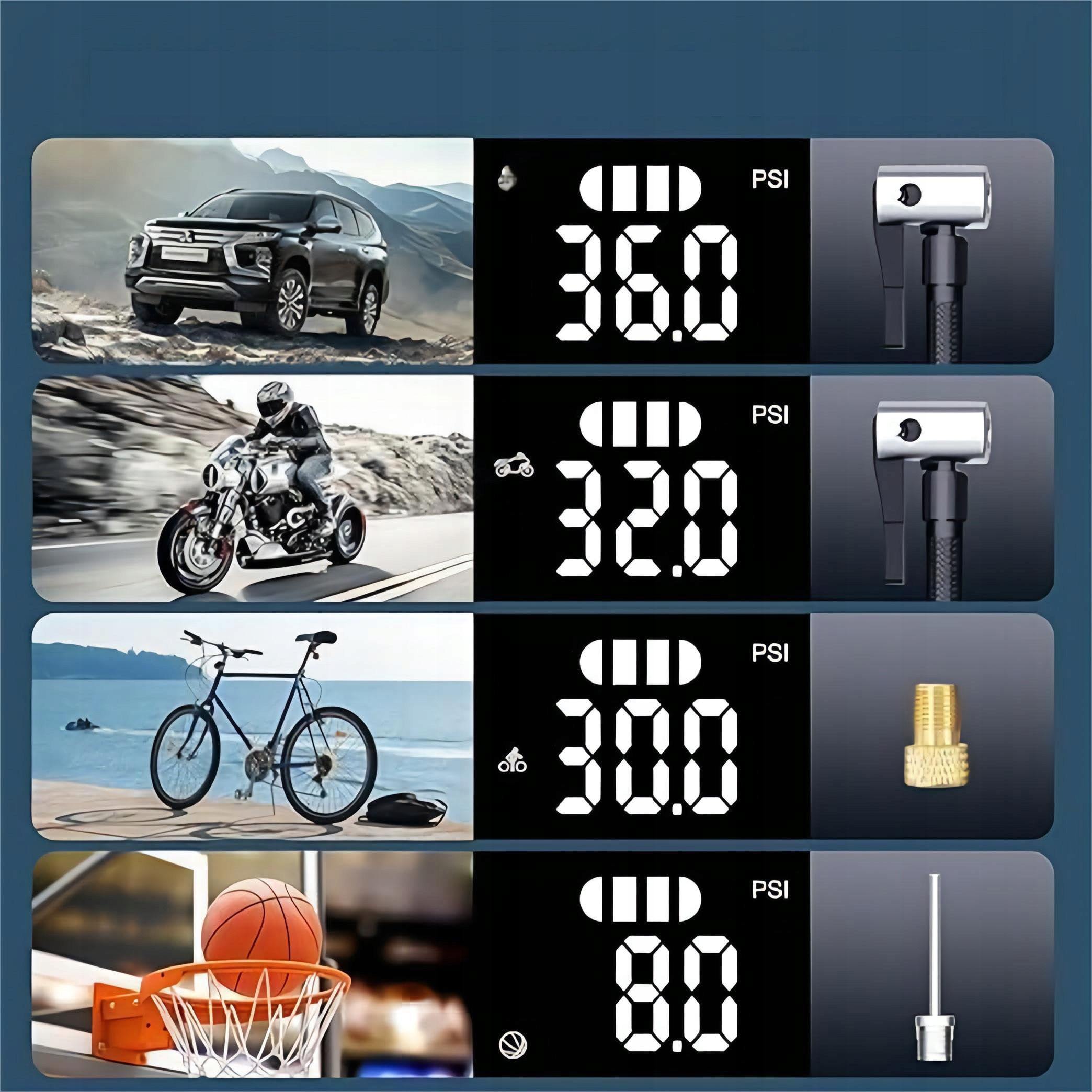 - 🏍 【Портативный воздушный компрессор для более быстрого насоса Всего за 1 минуту этот насос способен надувать шину с давления от 25 до 36 фунтов на квадратный дюйм, и всего за 5 минут он может надуть автомобильную шину с давления от 0 до 36 фунтов на квадратный дюйм. Кроме того, точность воздушного насоса остается на уровне ± 1,5 фунтов на квадратный дюйм. Это идеальное дополнение к портативному устройству для накачки шин в вашем автомобиле