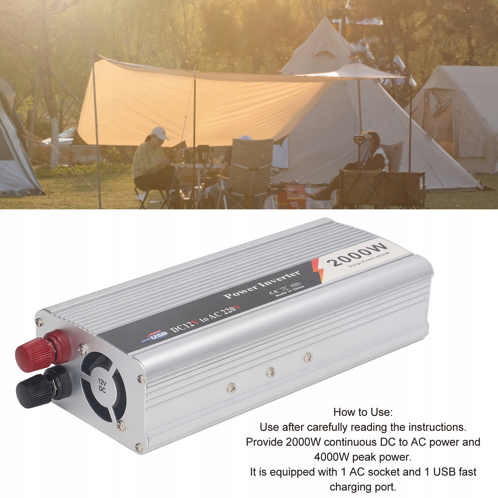 2. Зарядка: оснащенный универсальной розеткой переменного тока и интерфейсом USB 5 В, преобразователь питания можно использовать для зарядки различных устройств.