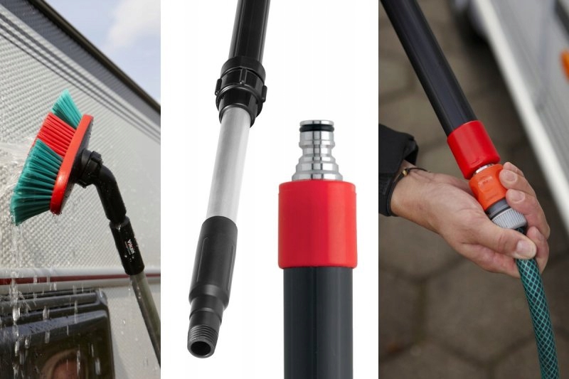 Телескопический стиль (ручка), к которому можно подключить шланг с проточной водой, совмещенный с щеткой, позволит мыть даже очень высокие транспортные средства, такие как автобус, трамвай или грузовик.