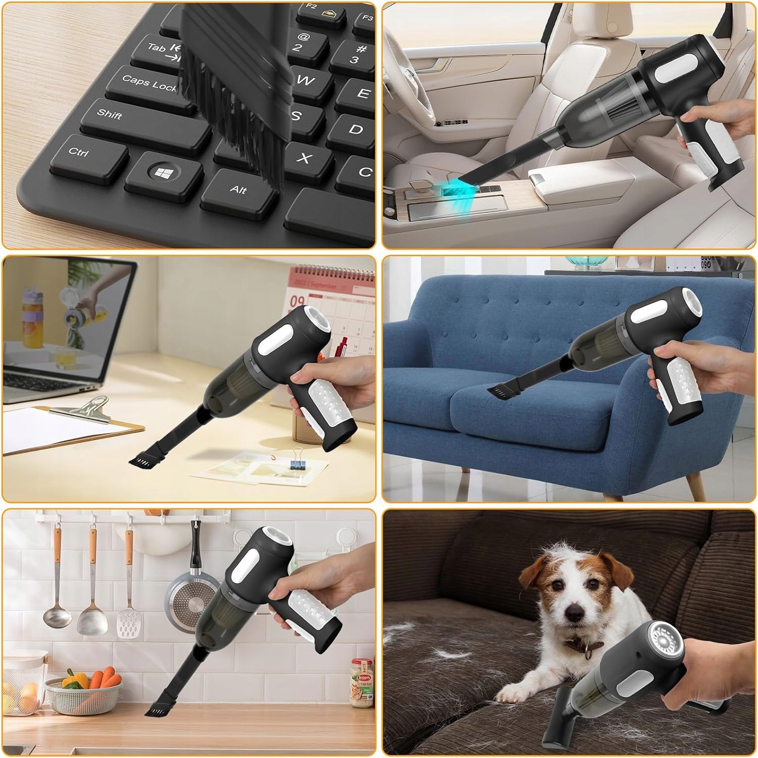 Сильное поглощение пыли, волос, остатков бумаги и пятен от воды. Портативные ручные пылесосы подходят для чистки корпусов настольных компьютеров/клавиатур/ноутбуков/полов/шкафов/диванов/кошачьей и собачьей шерсти/дверных ручек/сидений/дверных ковриков/углов/щелей/частиц и т. д.