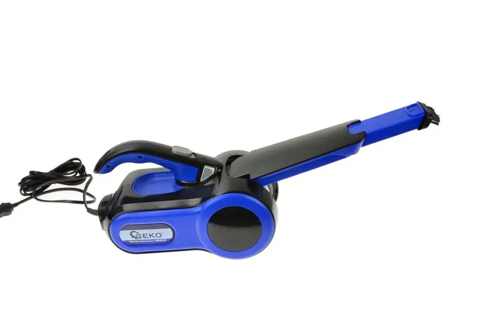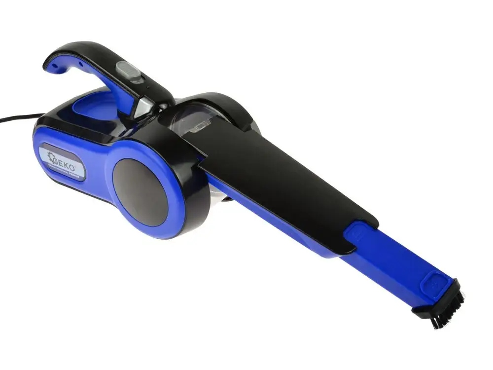 Автомобильный пылесос известной марки GEKO с питанием от сети 12 В. Оснащен электродвигателем мощностью 80 Вт. Всасывающий модуль пылесоса со встроенной телескопической щелевой насадкой можно установить в 11 положений, что облегчает уборку в труднодоступных местах.