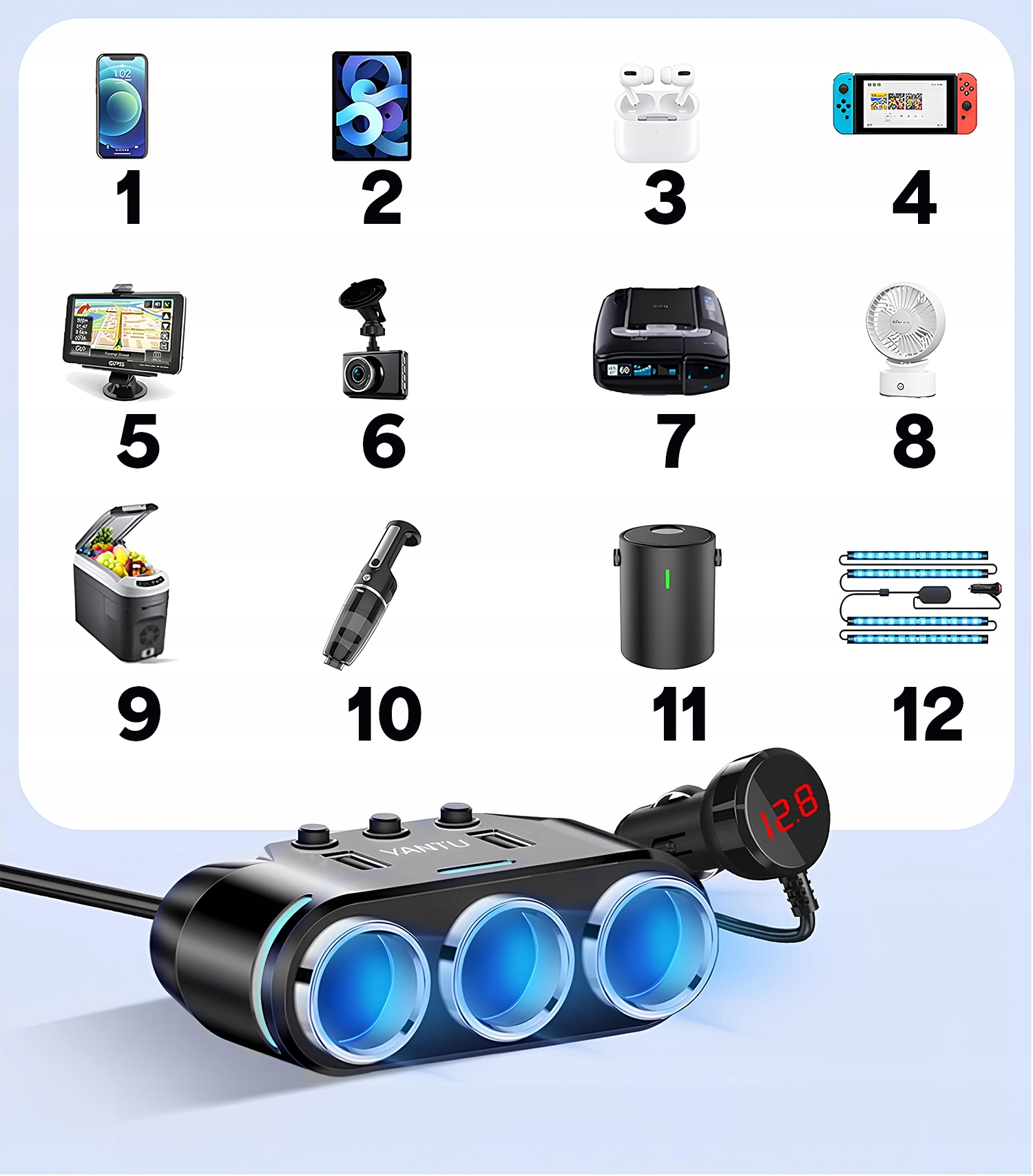 Yantu – очень функциональный разветвитель для автомобильного прикуривателя. Изделие распределяет их на целых 3 дополнительных порта с максимальной мощностью 100 Вт. Дополнительным преимуществом являются 2 встроенных USB-порта. Благодаря этому несколько устройств могут использовать сплиттер одновременно.