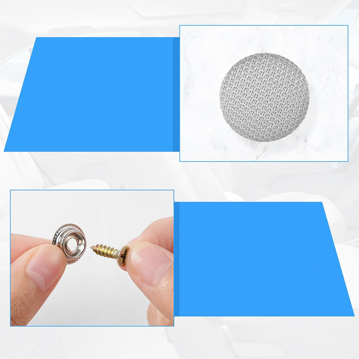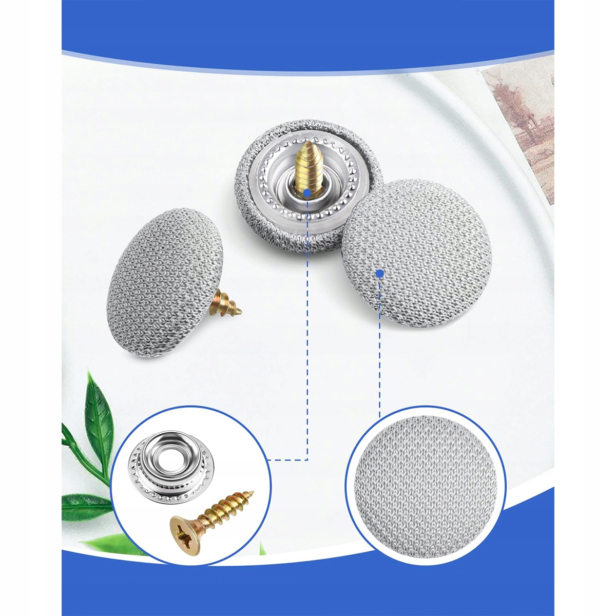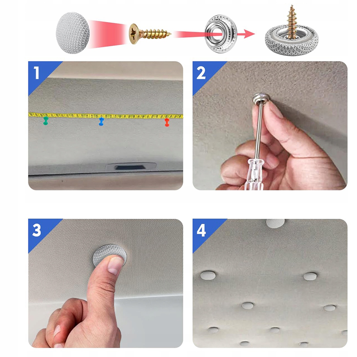 Кнопка для ремонта обивки потолка автомобиля изготовлена из сетки, а ее поверхность имеет специальное покрытие, предотвращающее ржавление заклепок. Оцинкованные винты и оцинкованное основание обеспечивают большую устойчивость зажима.