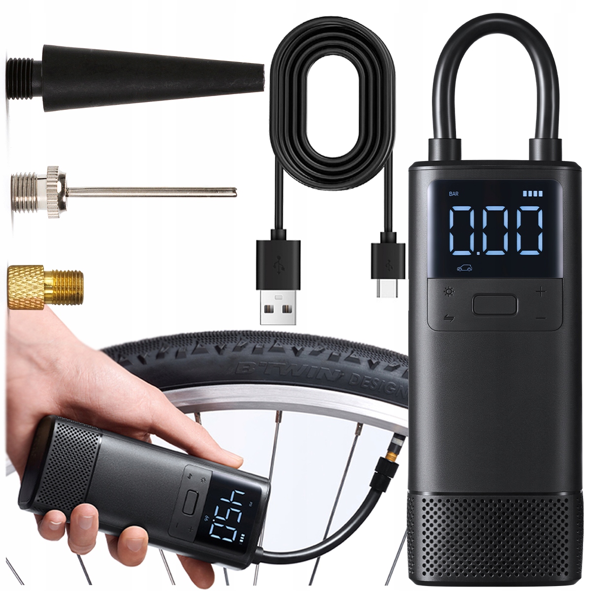 - 3 наконечника (разъем Presta клапан, игла, длинная насадка)