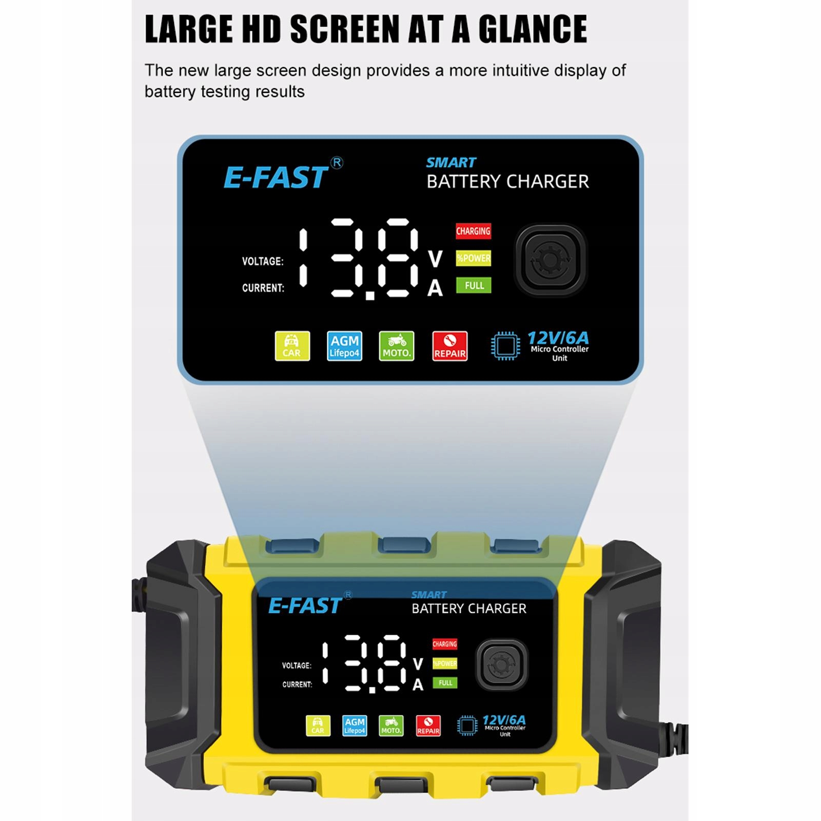 [много режимов зарядки]: включая автомобильный режим, режим мотоцикла, режим LifePo4, режим ремонта. Аккумуляторное зарядное устройство подходит как для аккумуляторов с кислотой, а также для батареи, батареи LifePo4