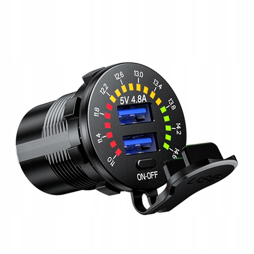 зарядное устройство с цифровым вольтметром, отображающим текущий уровень напряжения батареи и два USB -порта USB -зарядки. Набор позволяет одновременно использовать обоих розеток, то есть зарядку, например, навигацию и телефон одновременно. Установка на плоских поверхностях, таких как приборная панель, автомобильная обивка или в случае двух швейных лет, например, в корпусе. После надлежащей сборки продукт будет водонепроницаемым и пыльным. Гнезда имеют крышку для воды
