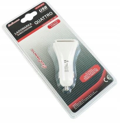 Зарядное устройство подключается к гнезду прикуривателя и имеет четыре USB-порта общей силой тока 4200 мА (2 х 1,0 А и 2 х 2,1 А).