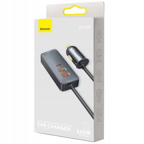 Автомобильное зарядное устройство Baseus Share Together оснащено разветвителем с кабелем длиной 1,5 метра, благодаря которому можно заряжать до Устройство 3(4-й вывод расположен на автомобильном зарядном устройстве) с заднего сиденья автомобиля. Дополнительно разветвитель имеет пряжку, позволяющую удобно подвешивать устройство, чтобы оно не мешало использованию.