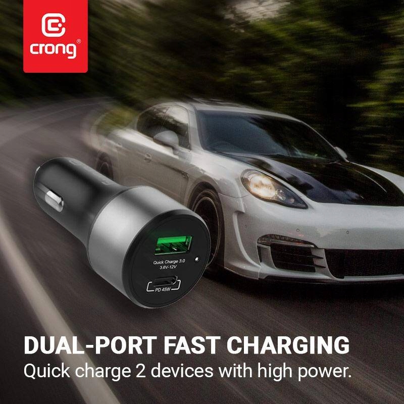 Автомобильное зарядное устройство Crong Power 63 Вт – USB-C PD 45 Вт + автомобильное зарядное устройство USB QC 3.0 18 Вт (черное)