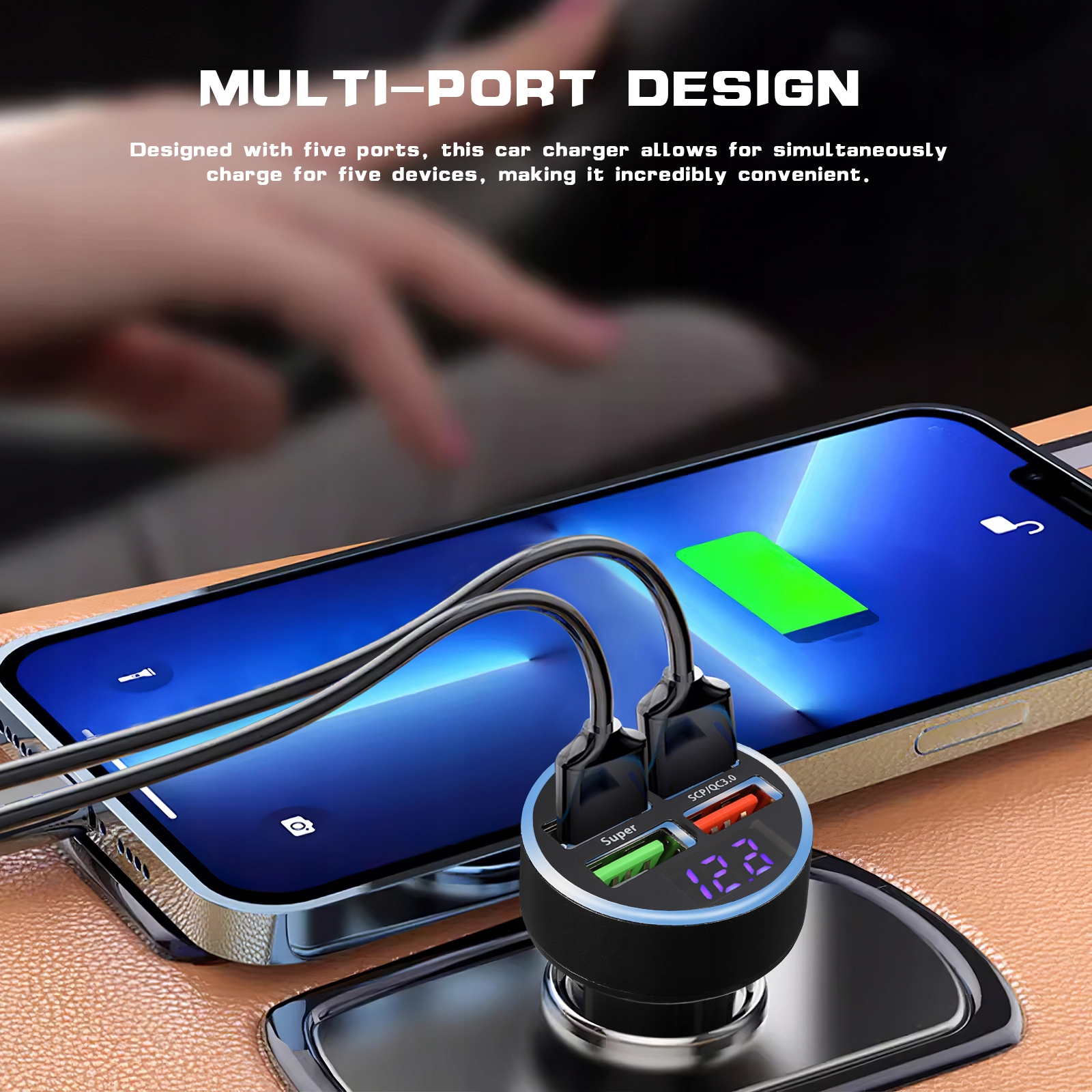 ✅ Многопортовый дизайн: Это автомобильное зарядное устройство с пятью портами позволяет заряжать пять устройств одновременно, что делает его чрезвычайно удобным.