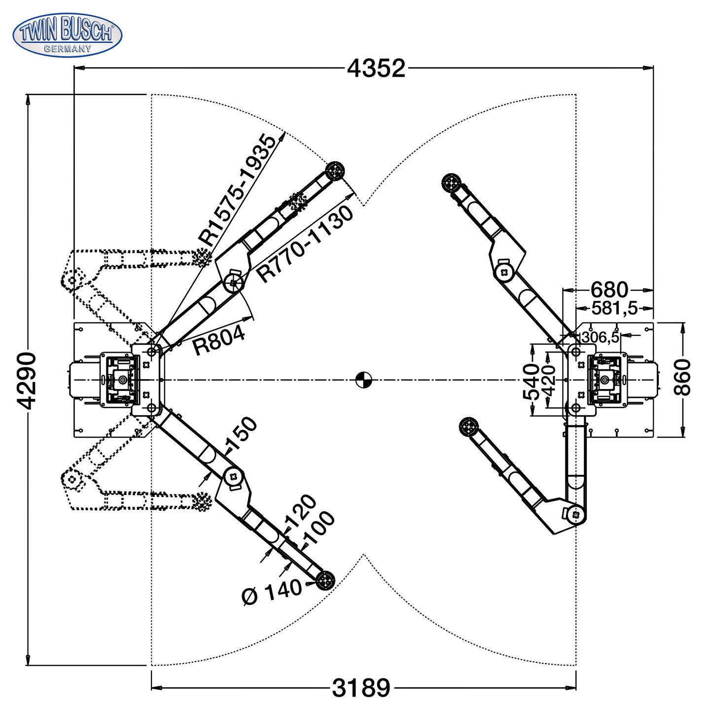 ➡️ Twin Busch TW 280-G Heavy Line — самый мощный двухколонный подъемник, предлагаемый немецким производителем. Благодаря грузоподъемности 8 тонн и симметричным телескопическим стрелам М с двойным шарниром он легко поднимает как небольшие легковые автомобили (например, Smart), так и автомобили доставки, кемперы и специальные автомобили с длинной колесной базой.