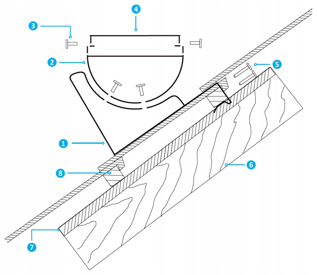 - Размещаем кронштейн DBDC-LN1 на черепице и прикрепляем его к обрешетке (8) с помощью шурупов с потайной головкой с минимальными размерами Ø 6 мм x 50 мм (5). Перед вкручиванием можно предварительно просверлить отверстие диаметром меньше диаметра шурупа, чтобы предотвратить растрескивание древесины.